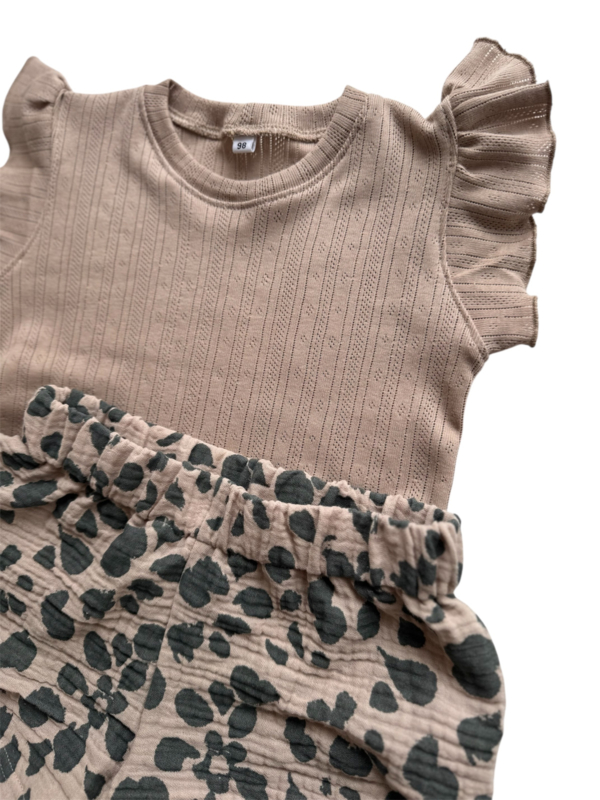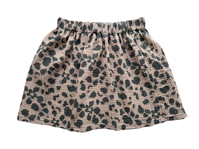 Luchtig zandkleurig rokje van hydrofiel met antraciet panterprint.