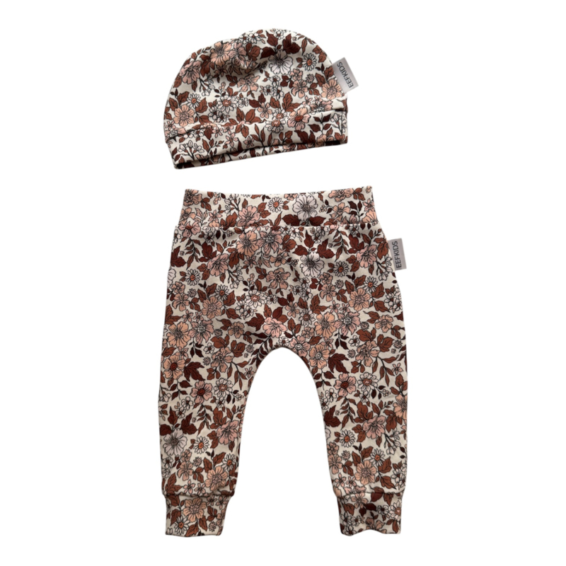 Broekje van ecru katoentricot met kleine bloemetjesprint.