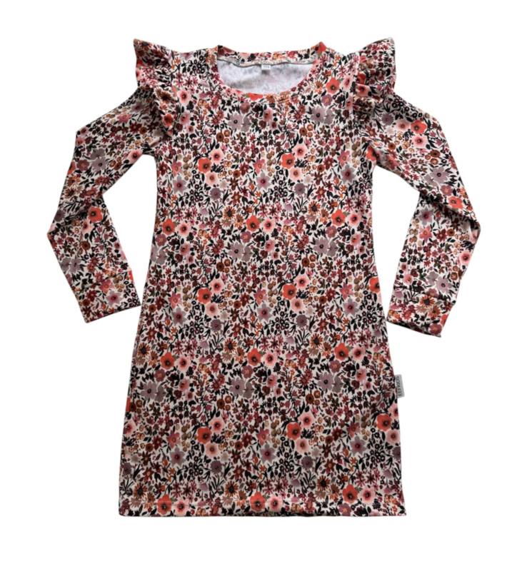 Jurkje Imme ‘Bloemetjes Beige’Jurkje van beige summersweatstof met roze en wijnrode bloemetjes.