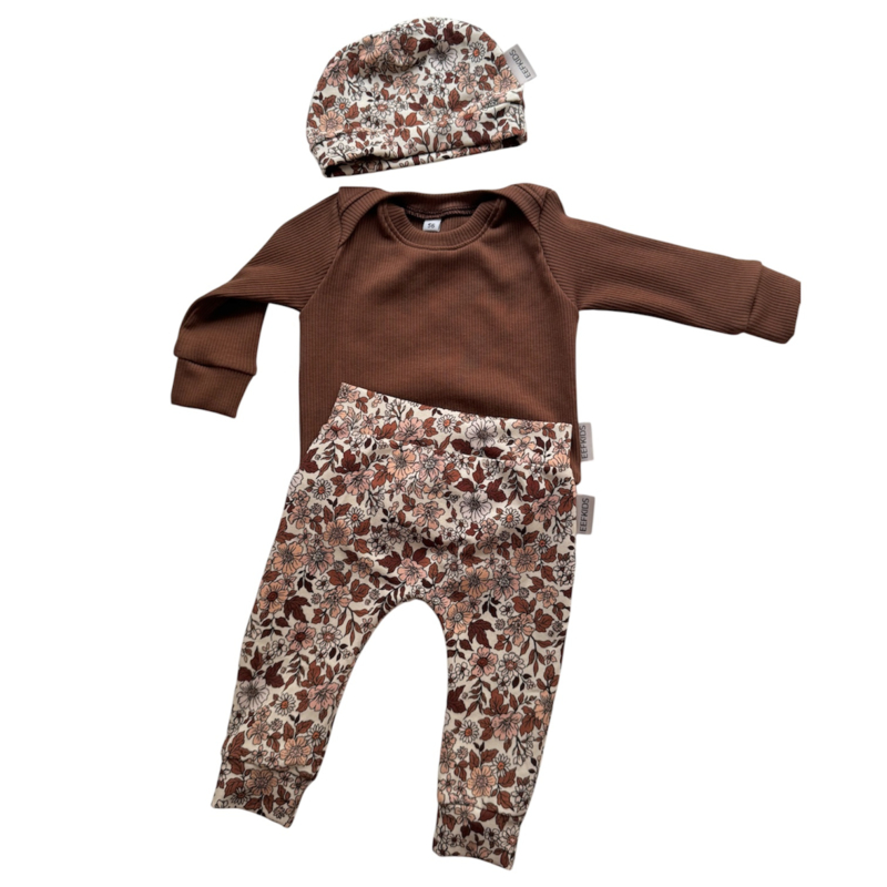 Broekje ‘Bloemetjes Cacao’Broekje van ecru katoentricot met kleine bloemetjes in bruin.
