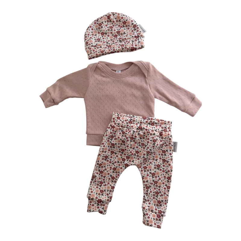 Broekje ‘Oudroze Bloem’Broekje van oudroze/leverkleurig katoentricot met kleine bloemetjes in ecru en zwart.