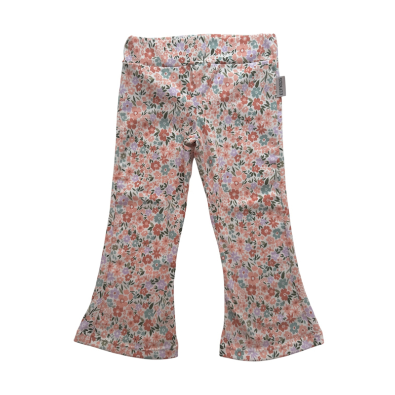 Flared ‘Bloemetjes Roze’Flared broekje van katoentricot met kleine bloemetjesprint.