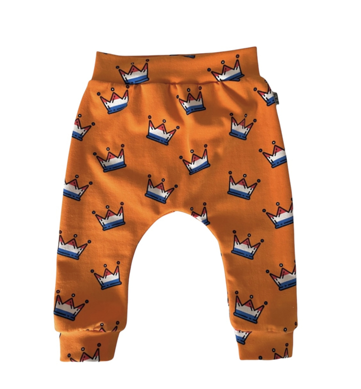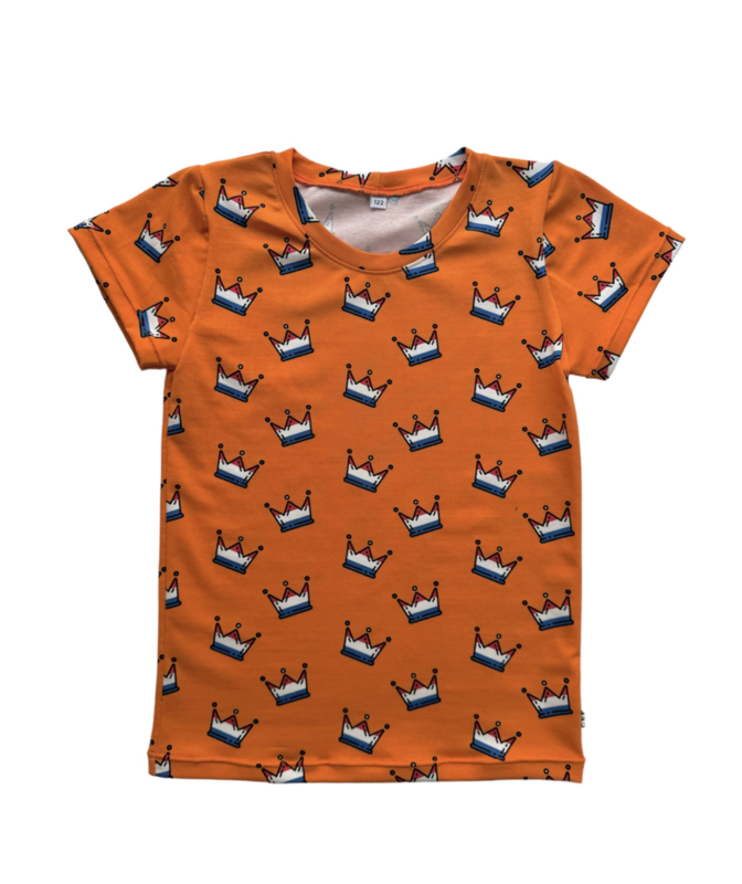 KoningsdagshirtFeestelijk koningsdagshirt van oranje katoentricot met kroontjes.